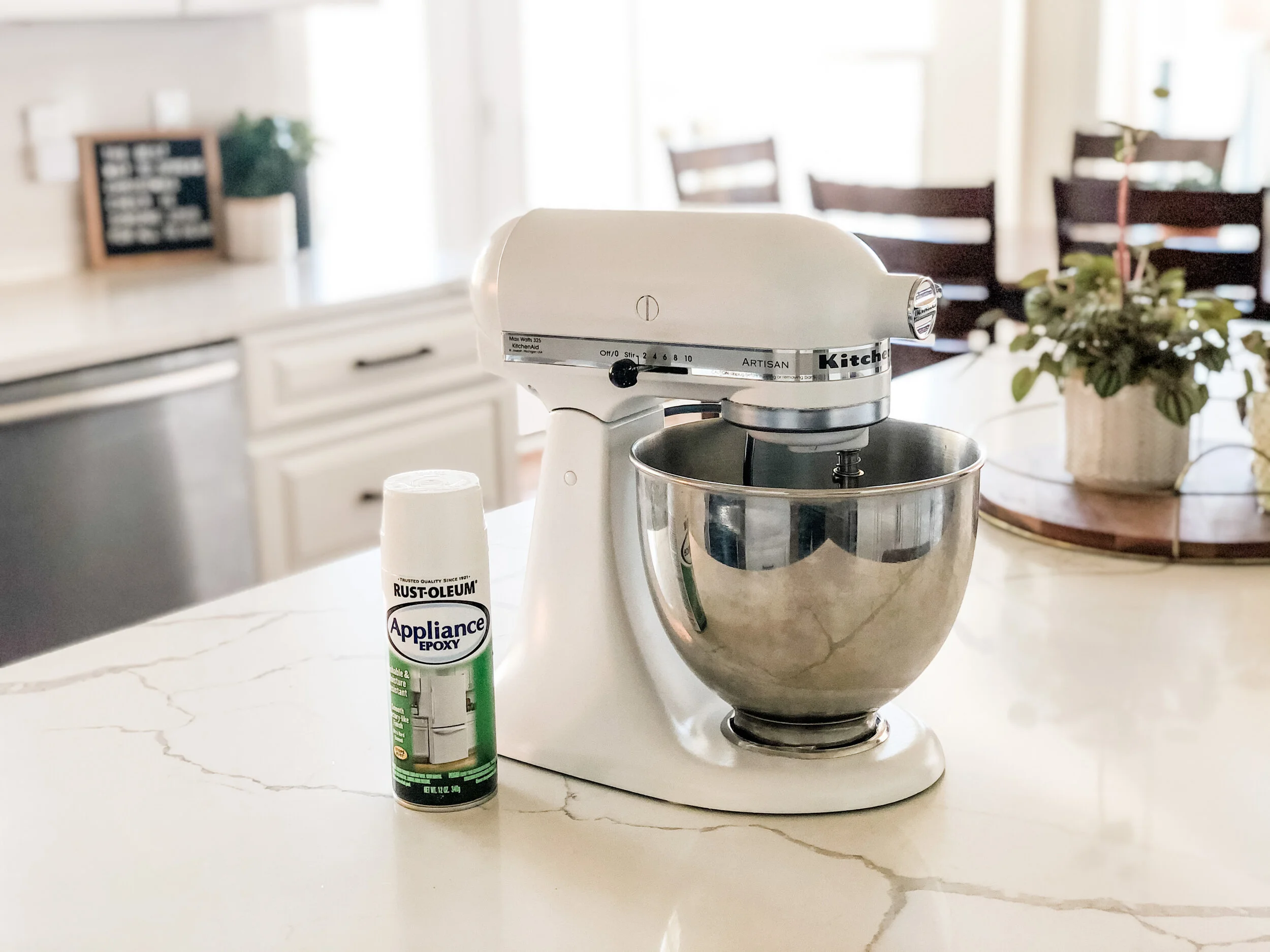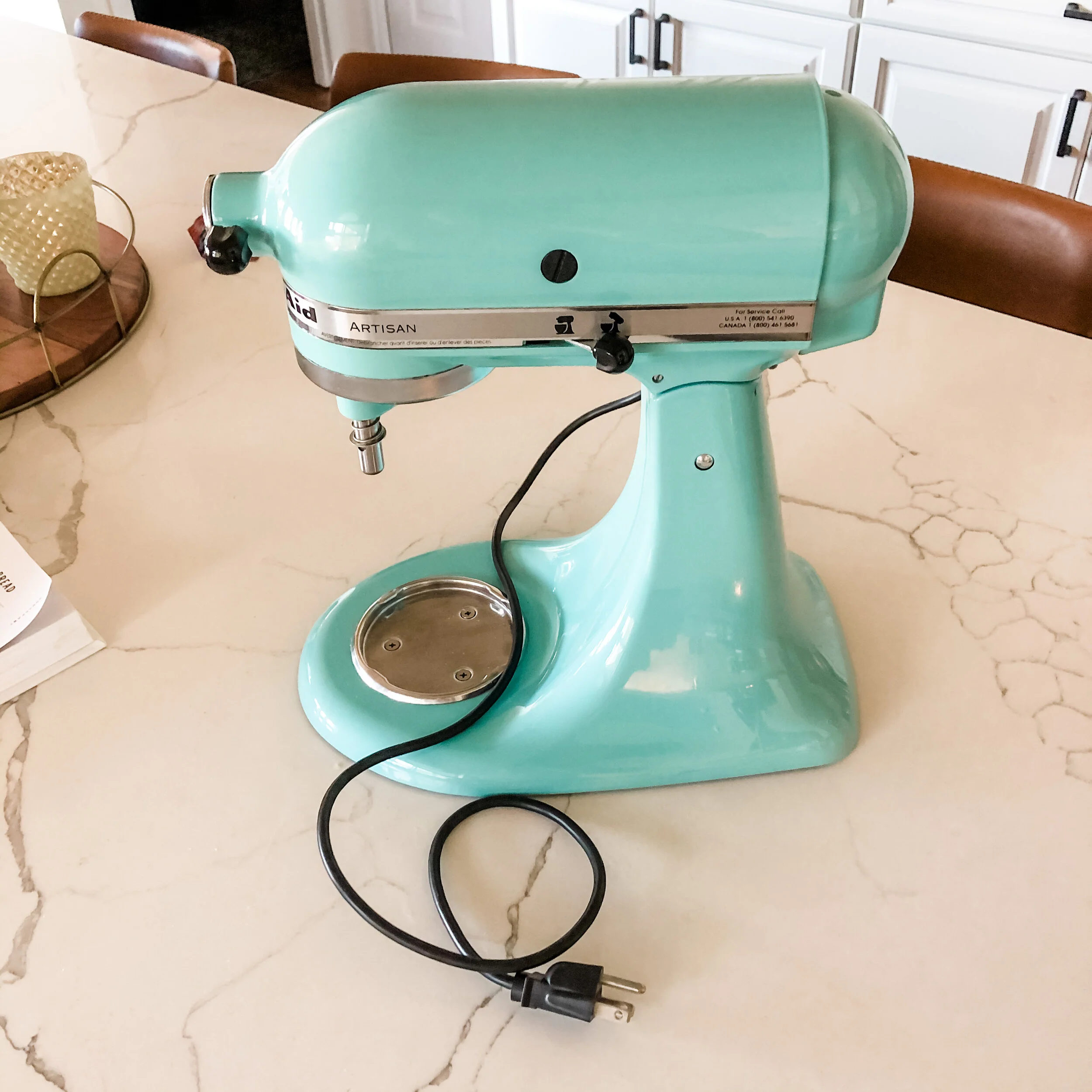 We were blessed to receive our mixer as a wedding present and that beautiful Robin’s Egg blue was my jam. I LOVED that color and had it accented throughout our home. I still love that color but lean more neutral. Now I know, it’s an appliance — color doesn’t matter. However I love this mixer so much I want to leave it out instead of carting it up and down out of the cabinet. With that, I went on a quest to see IF it was possible to paint it… and how to do it.
